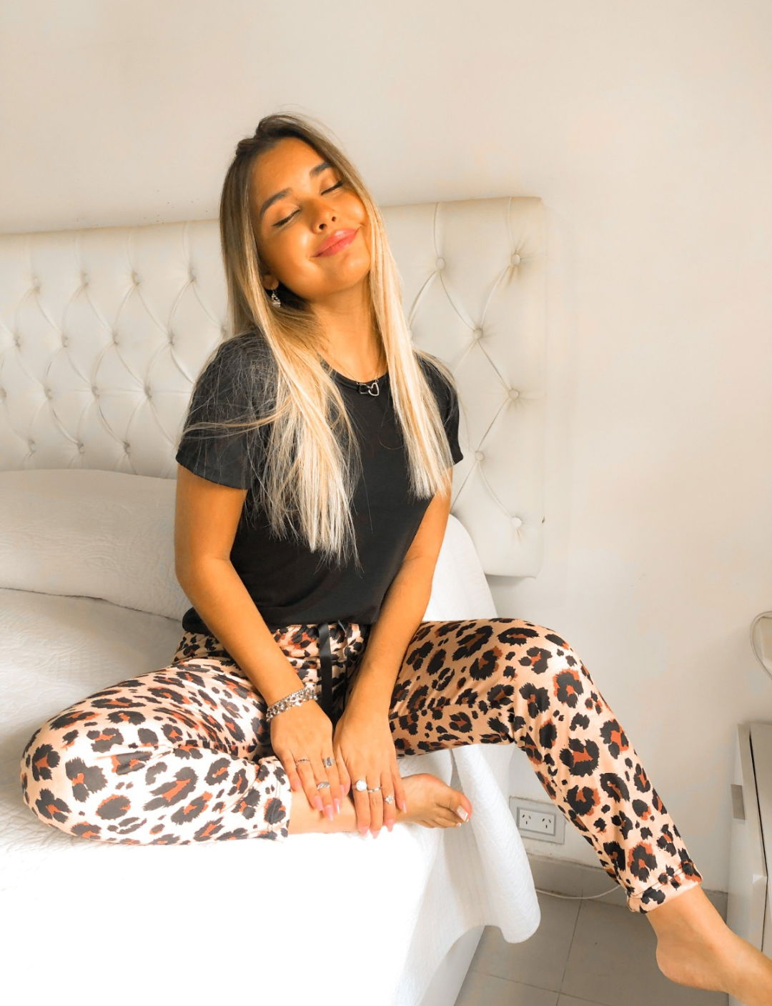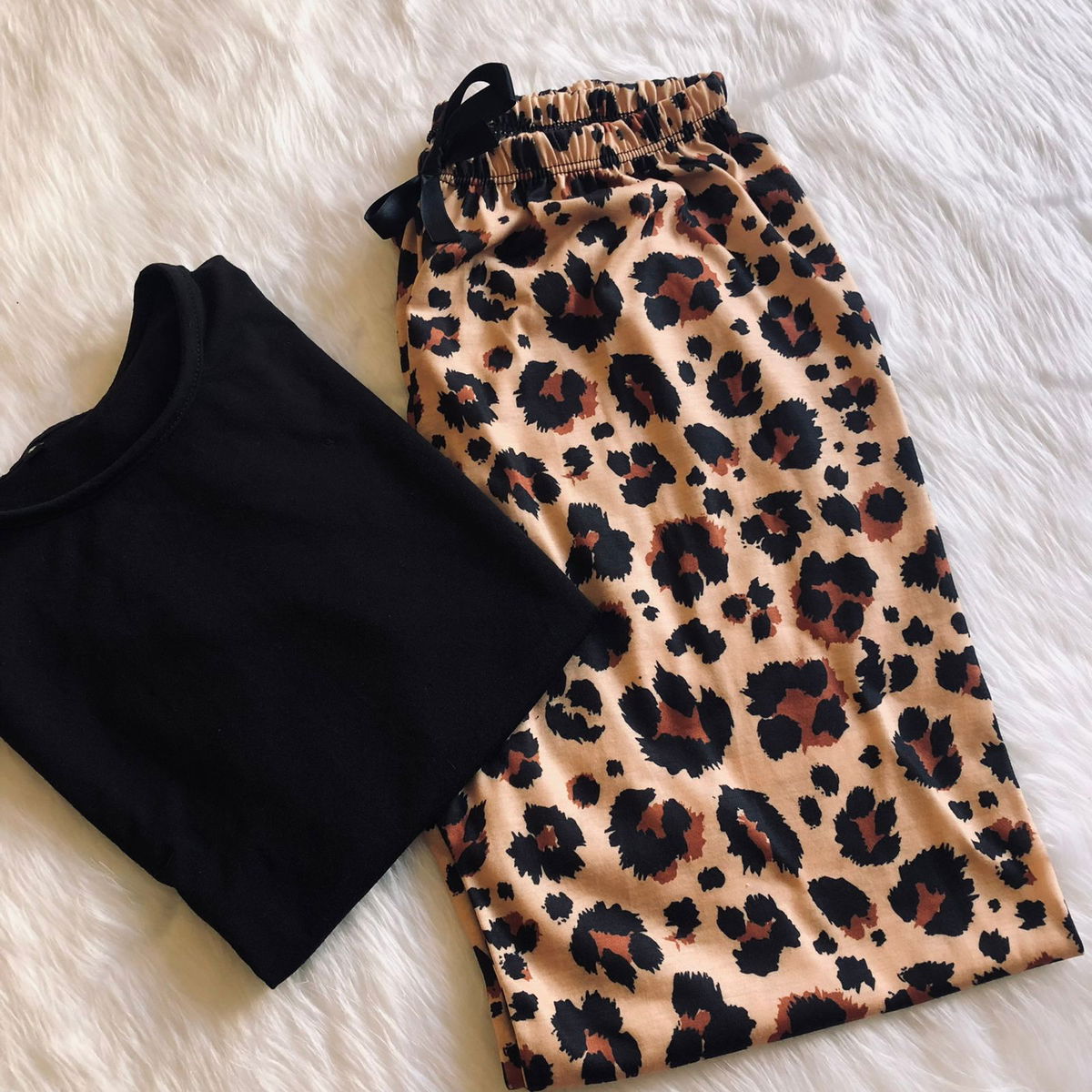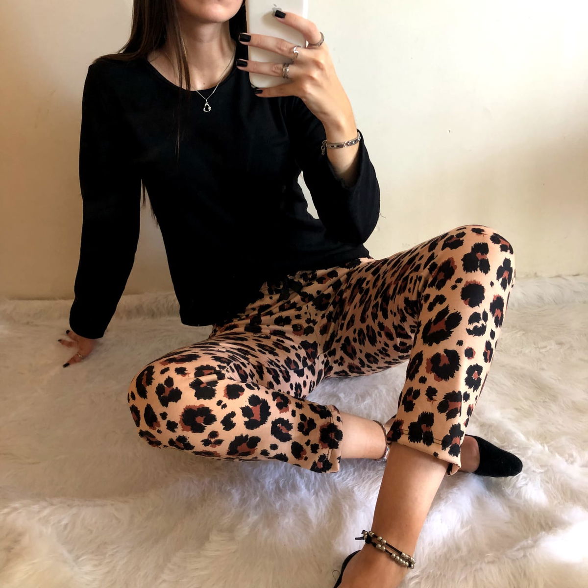 Pantalón de diseño con remera negra, manga larga.